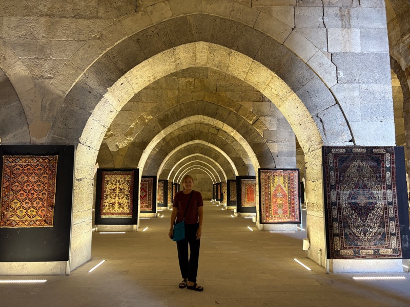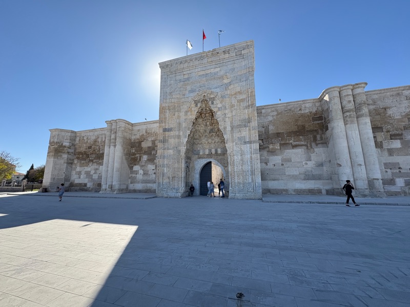 On route to Cappadocia, we stopped at the Caravanserai of Sultanhan which is a beautiful kind of roadside inn built along an ancient trade route for travelers, merchants, and their animals built in the 13th century. This one in Antolia is one of the best preserved in the world. There are massive stone walls and gates for protection.